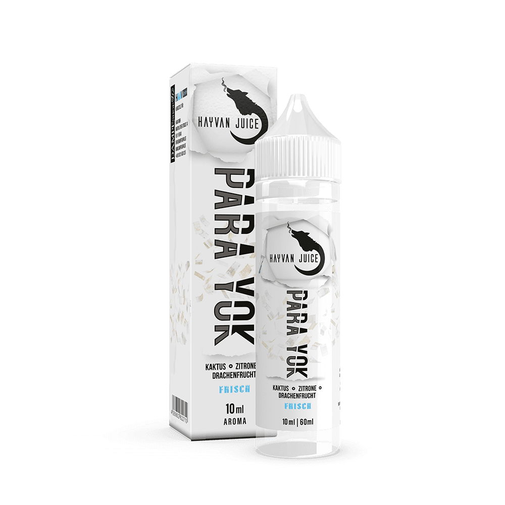 Wenn du das Para Yok Aroma von Hayvan Juice einmal gekauft hast, wird es dir dauerhaft in Erinnerung bleiben. Denn bei diesem Aroma von Hayvan Juice geht es so richtig fruchtig zu. Freche Früchte haben sich versammelt, um dir einen erstklassigen tropischen Geschmacksgenuss zu bieten und das ist ihnen durchaus gelungen. Hier kommt alles zusammen, was du nur saisonal in deutschen Märkten erhältst. Genieße die leckere Drachenfrucht kombiniert mit der feinen Note von Kaktus. Ein wenig Gewohntes gibt es durch den Spritzer Zitrone, der neben der Süße auch noch eine saure Note verleiht. Dazu noch ein wenig Minze und fertig ist dein Dampfcocktail. Wir senden dir eine 60 ml Flasche zu, die zu 10 ml mit deinem Wunscharoma befüllt ist. Jetzt bist du gefragt. Versetze das Aroma mit Base und Shots in Schwingung, warte 15 Minuten ab und genieße dein herausragendes Frucht-Liquid in vollen Zügen. Wir wünschen viel Spaß!