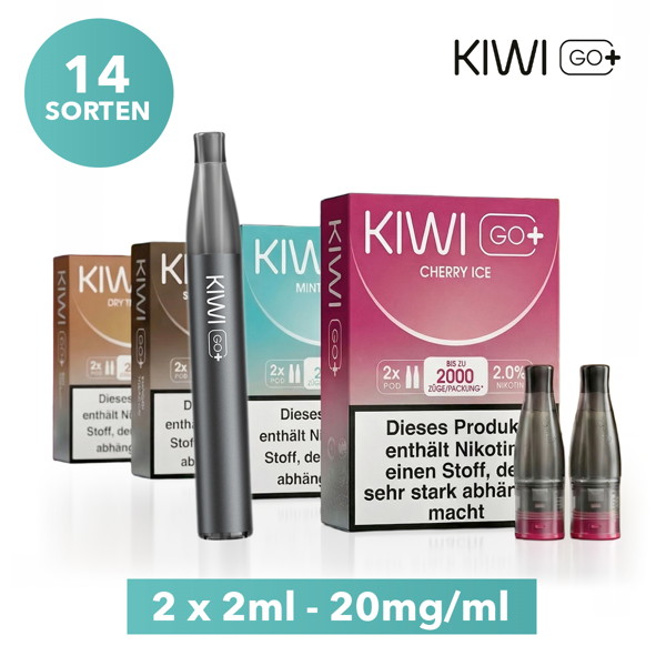 Die KIWI GO+ Pods werden im Zweierpack mit jeweils 2 ml geliefert und enthalten 20 mg/ml Nikotinsalz. Das bedeutet für dich: