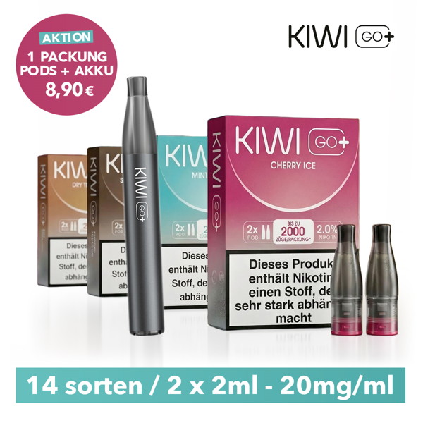 Ein einzelner KIWI GO+ Pod ermöglicht bis zu ca. 1.000 Züge. Da jeder Geschmack als Zweierpack mit 2 × 2 ml geliefert wird, hast du insgesamt ca. 2.000 Züge pro Packung.